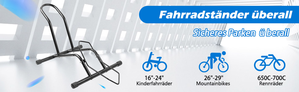 Dieser Fahrradständer ist äußerst vielseitig und passt auf fast alle Fahrräder. Egal, ob Mountainbike oder Rennrad – er kann Reifenabmessungen von 16 bis 29 Zoll und einer Breite von 1,25 bis 2,3 Zoll mühelos aufnehmen. Damit ist er die perfekte Lösung für jede Art von Fahrrad.