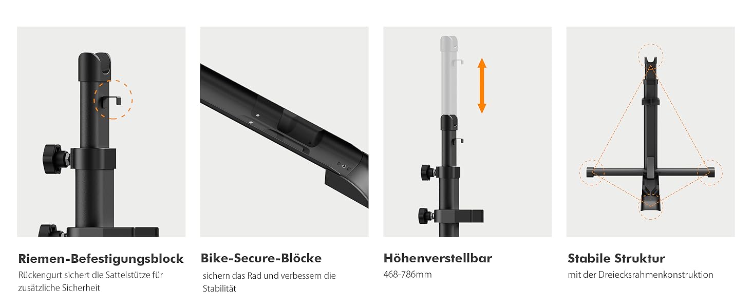 Mit einem Höhenverstellbereich von 46,8 cm bis 76,6 cm passt sich dieser Ständer perfekt an Ihren individuellen Stauraum an. Diese Funktion gewährleistet, dass Ihr Fahrrad immer bequem und sicher verstaut werden kann, egal in welchem Raum. So bleibt Ihr Umfeld aufgeräumt und Ihr Fahrrad stets an einem leicht zugänglichen Ort.